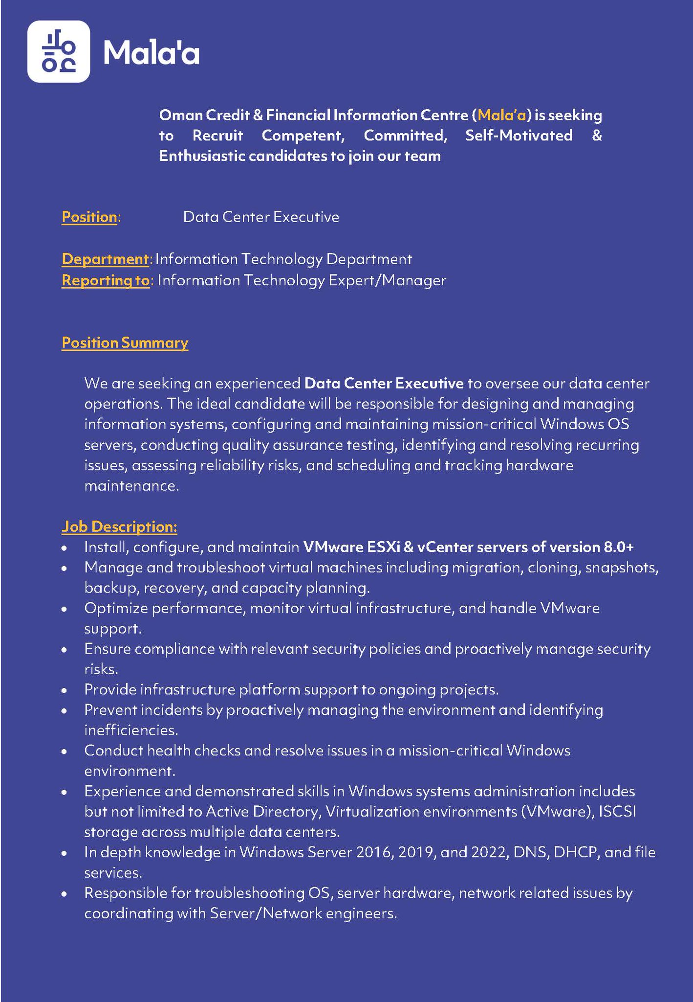 مركز عُمان للمعلومات الائتمانية والمالية (ملاءة) - وظائف شاغرة ( تنفيذي مركز البيانات )
