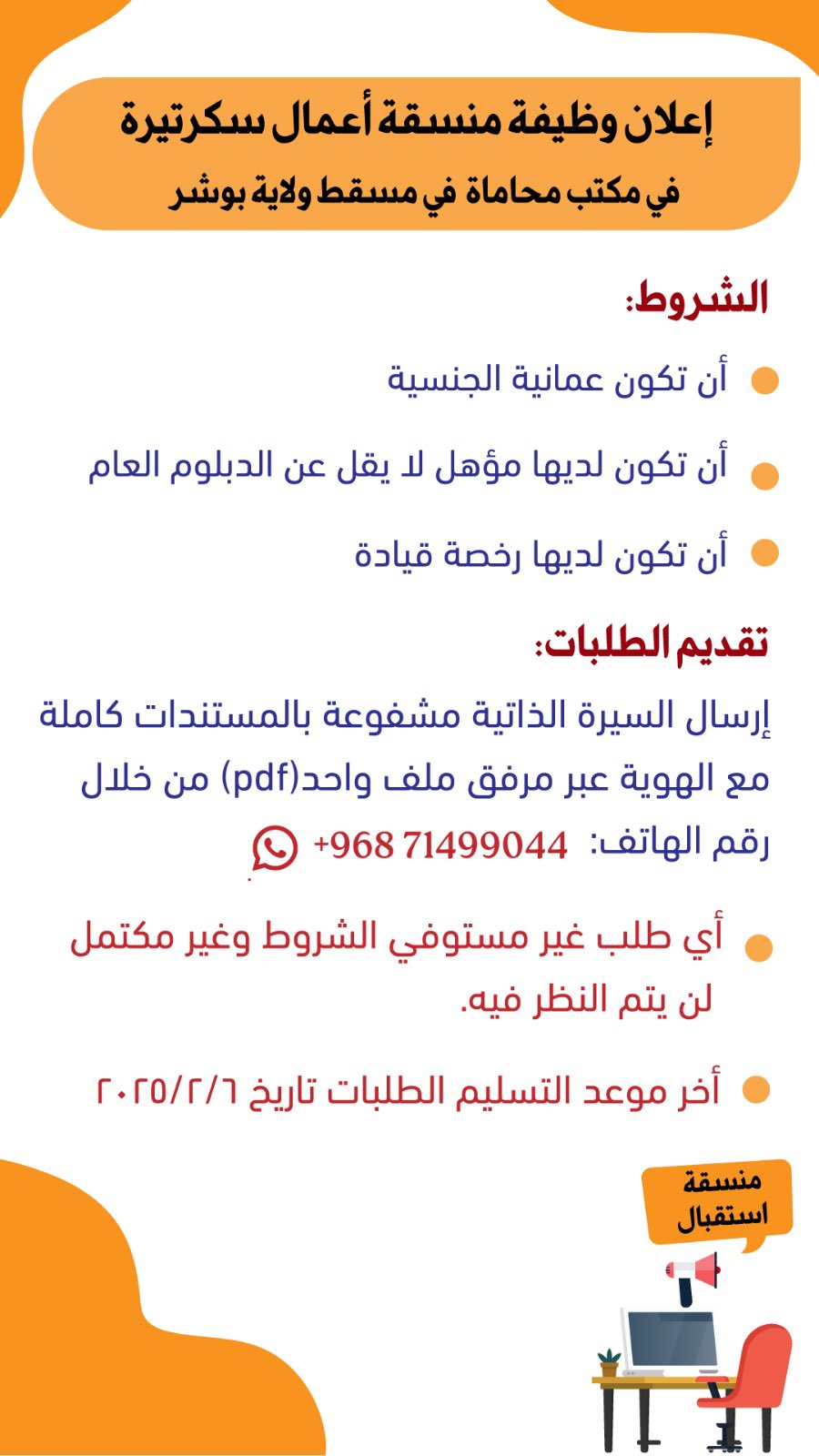 مكتب محاماة في مسقط - وظيفة شاغرة ( منسقة أعمال سكرتيرة )