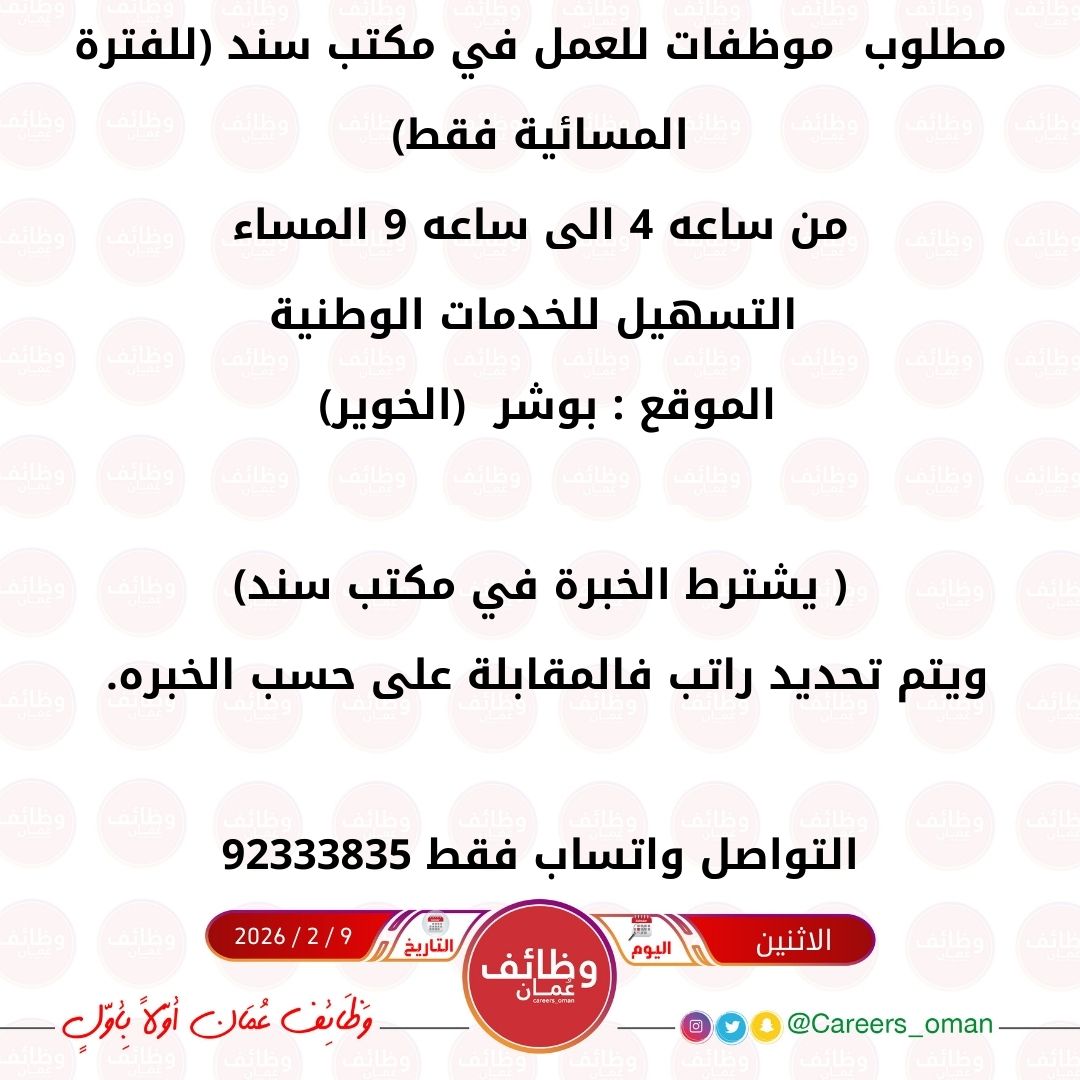 مكتب سند للخدمات في بوشر - وظيفة شاغرة ( موظفة )