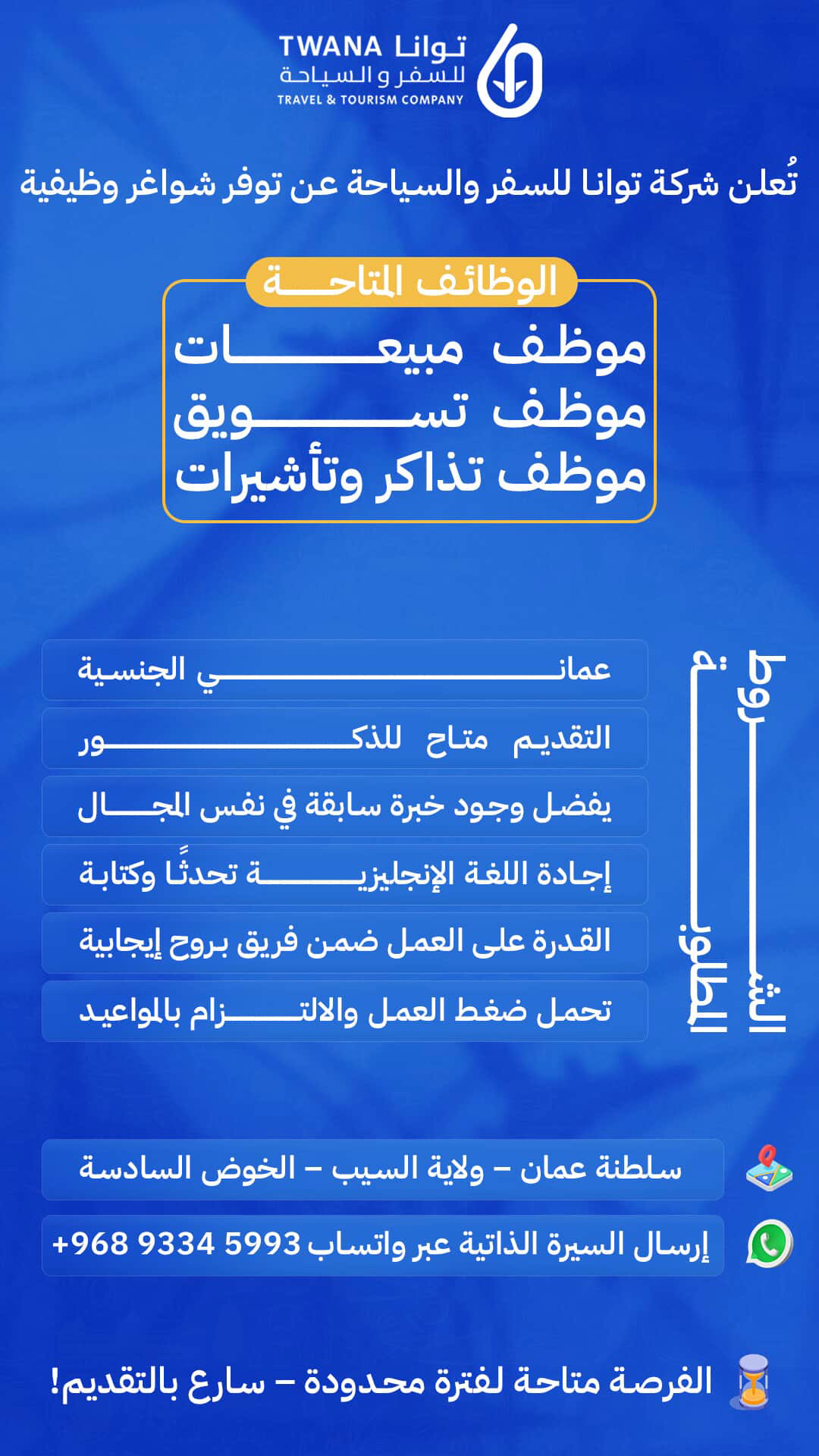 شركة توانا للسفر والسياحة في الخوض - توفر شواغر وظيفية ( موظف مبيعات + موظف تسويق + موظف تذاكر وتأشيرات )