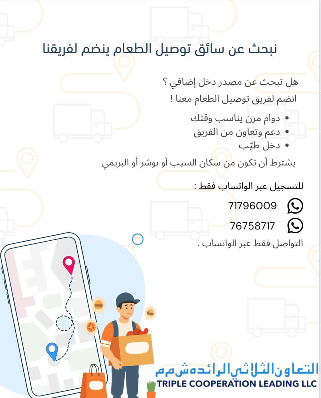 شركة التعاون الثلاثي الرائده - فرصة شاغرة ( سائق توصيل من سكان السيب أو بوشر أو البريمي )