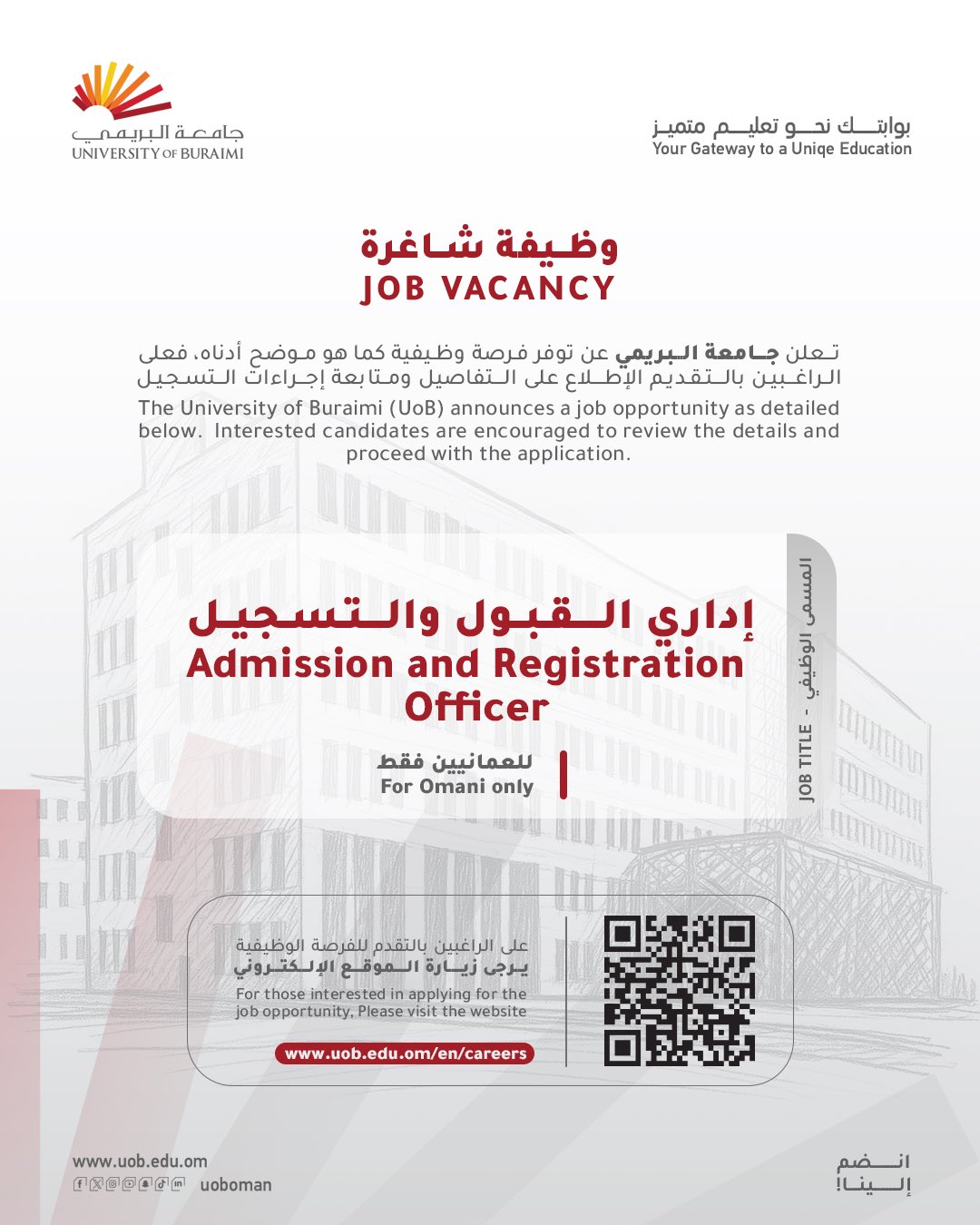 جامعة البريمي - وظيفة شاغرة ( إداري القبول والتسجيل )