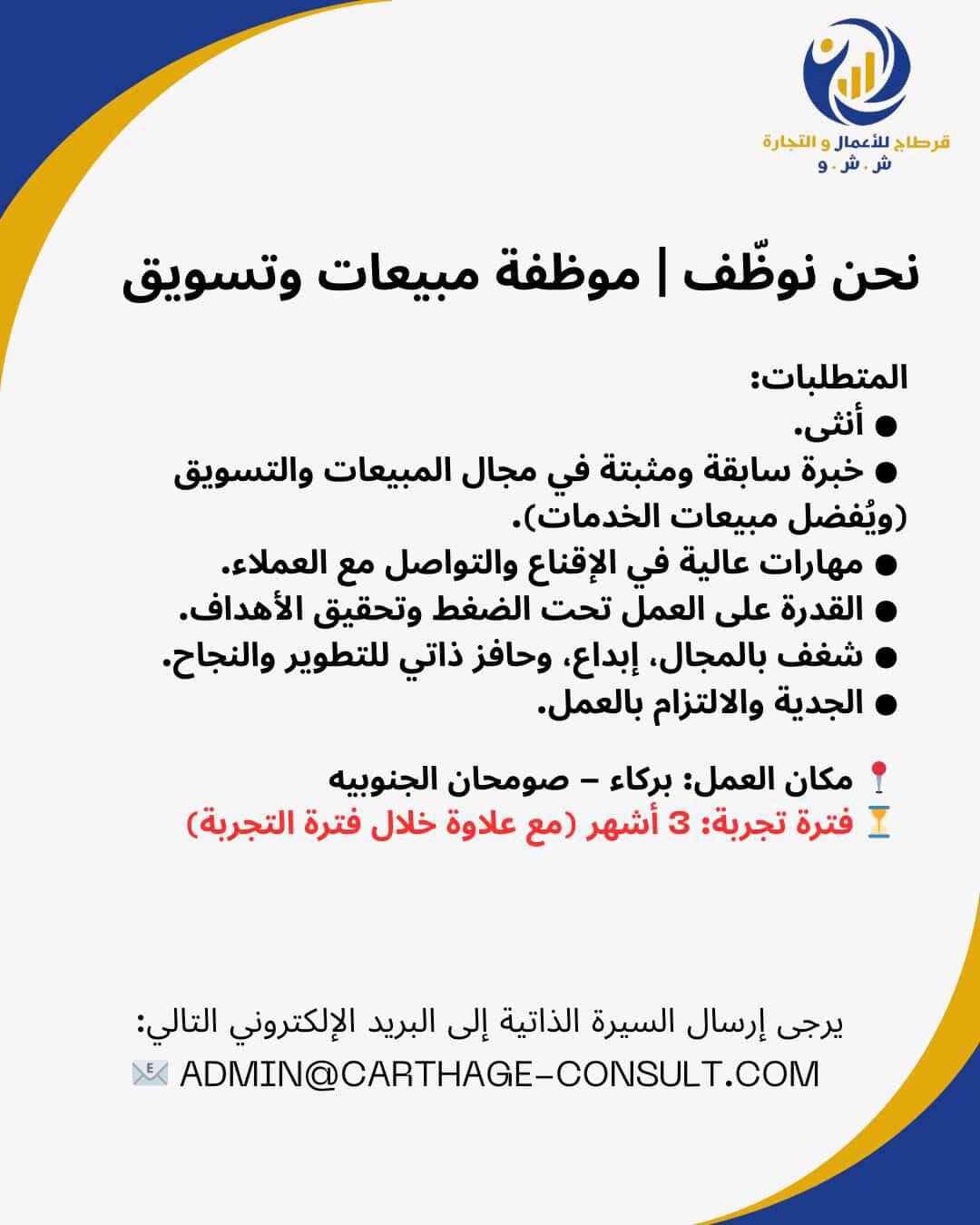 شركة قرطاج للأعمال والتجارة في بركاء - وظيفة شاغرة ( موظف/ة تسويق ومبيعات )