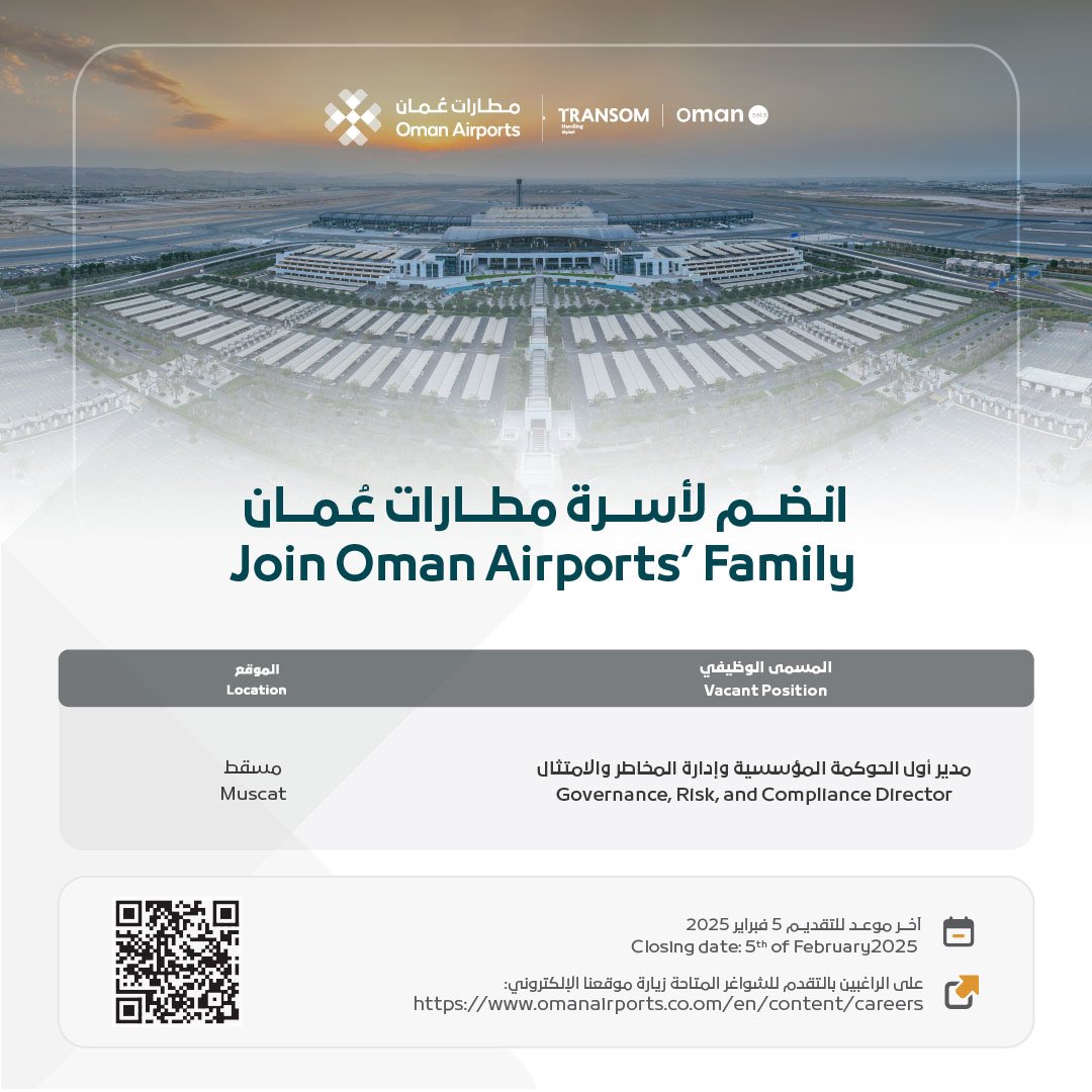 مطارات عمان - وظيفة شاغرة ( مدير أول الحوكمة المؤسسية وإدارة المخاطر والامتثال )