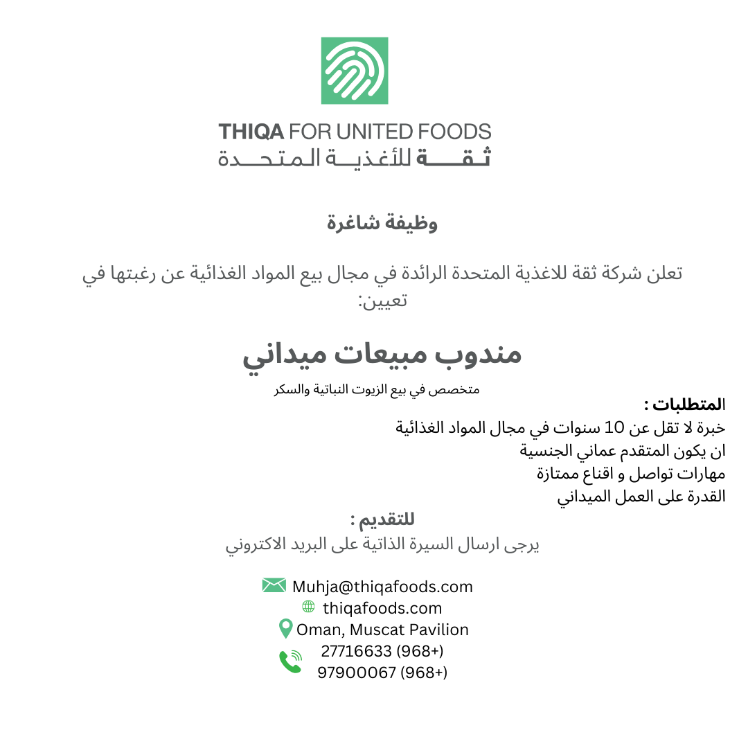 شركة ثقة للاغذية المتحدة في مسقط - وظيفة شاغرة ( مندوب مبيعات ميداني )