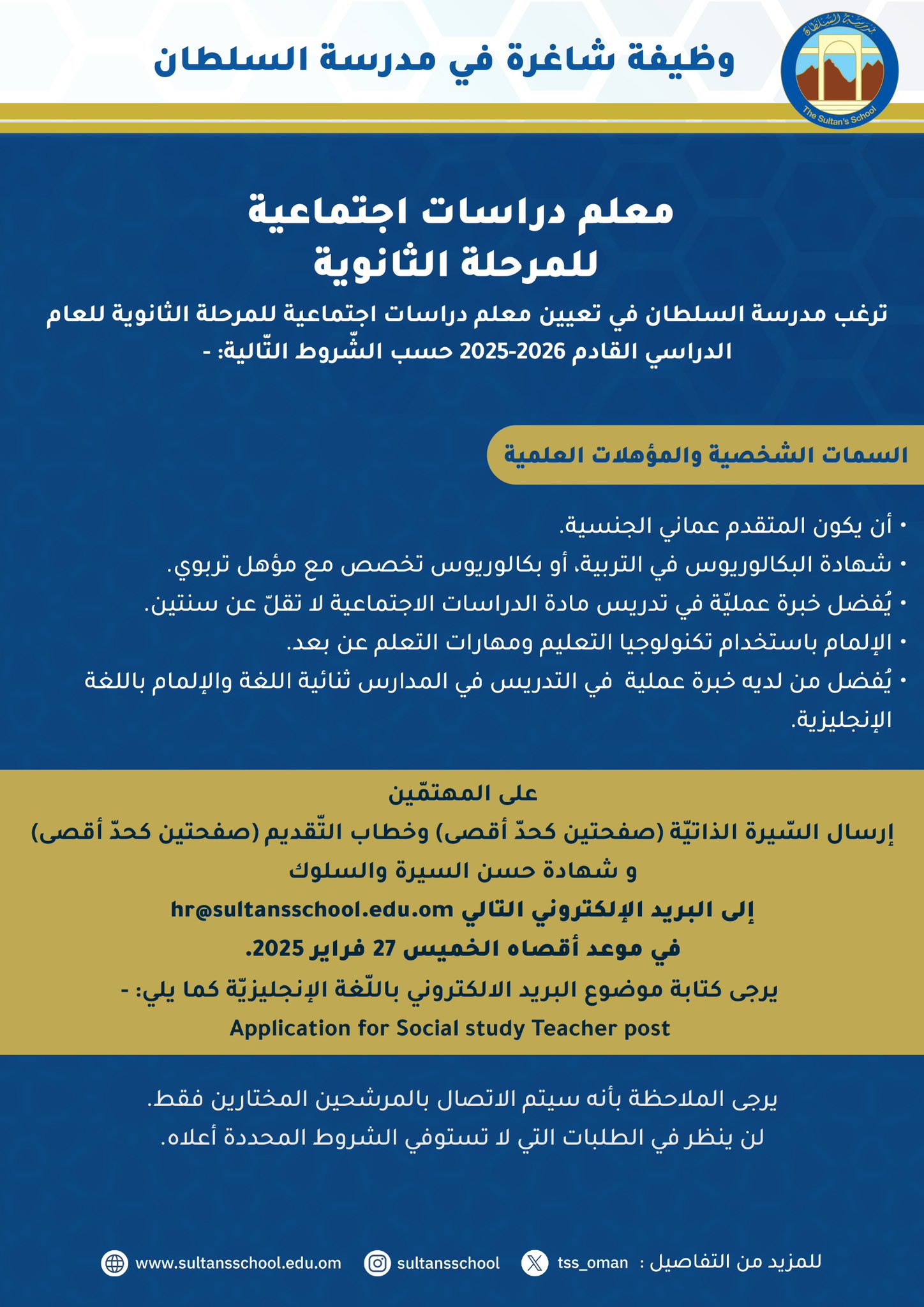 مدرسة السلطان - وظيفة شاغرة ( معلم دراسات اجتماعية )