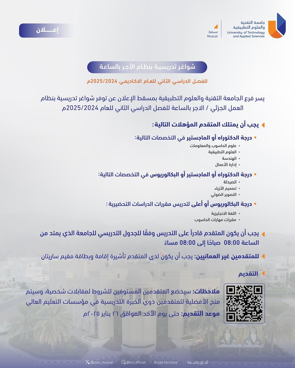جامعة التقنية والعلوم التطبيقية بمسقط - شواغر تدريسية بنظام الاجر بالساعة