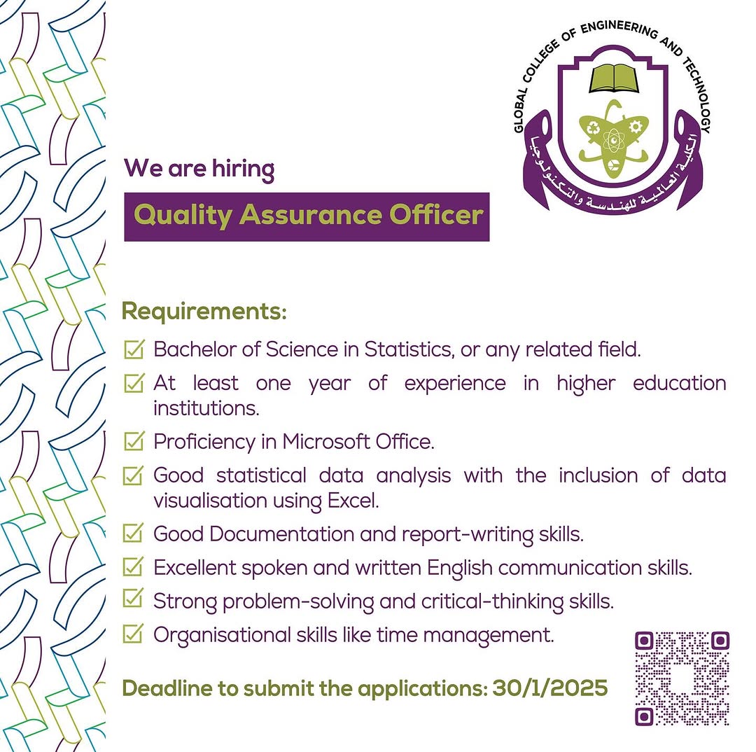 الكلية العالمية للهندسة والتكنولوجيا - وظائف شاغرة ( Research Assistant + Quality Assurance Officer )