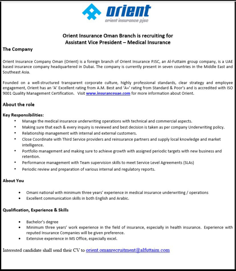 شركة أورينت للتأمين - وظيفة شاغرة ( Assistant Vice President - Medical Insurance )