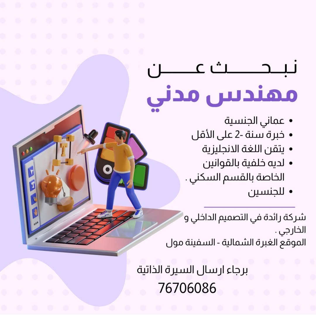 احدى الشركات الرائدة في مجال التصميم الداخلي في الغبرة - وظيفة شاغرة ( مهندس مدني )