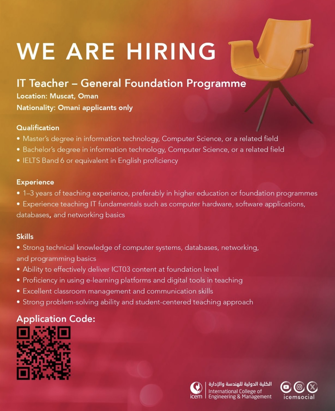 الكلية الدولية للهندسة والإدارة - وظيفة شاغرة ( IT Teacher - General Foundation Programme )