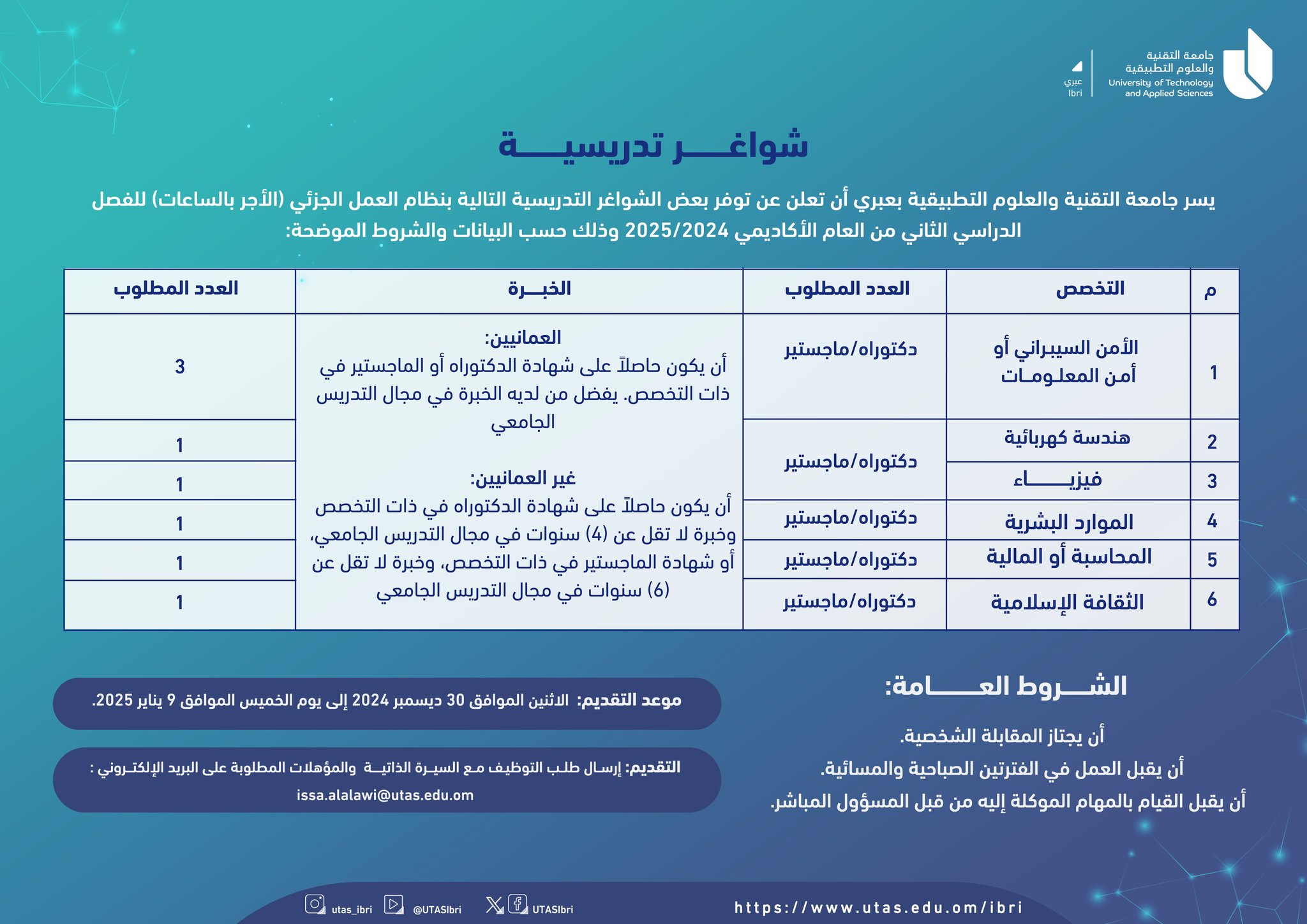 جامعة التقنية والعلوم التطبيقية بعبري - توفر بعض الشواغر التدريسية التالية بنظام العمل الجزئي (الأجر بالساعات)