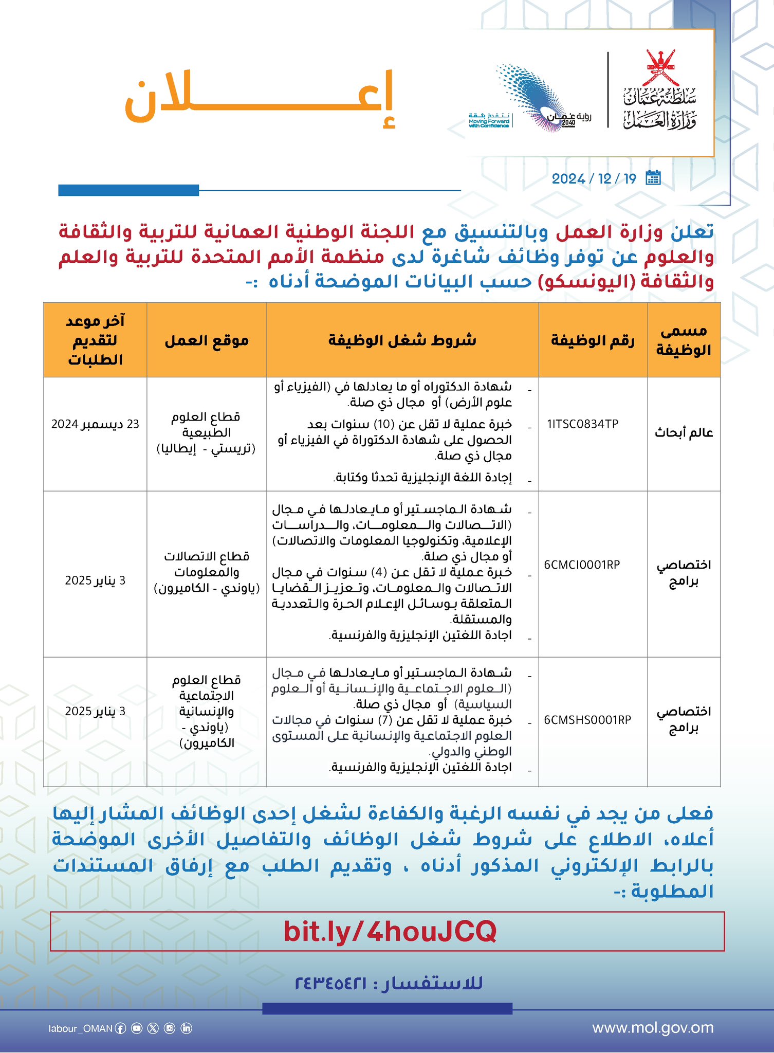 وزارة العمل وبالتنسيق مع اللجنة الوطنية العمانية للتربية والثقافة والعلوم - توفر وظائف شاغرة لدى منظمة (اليونسكو)
