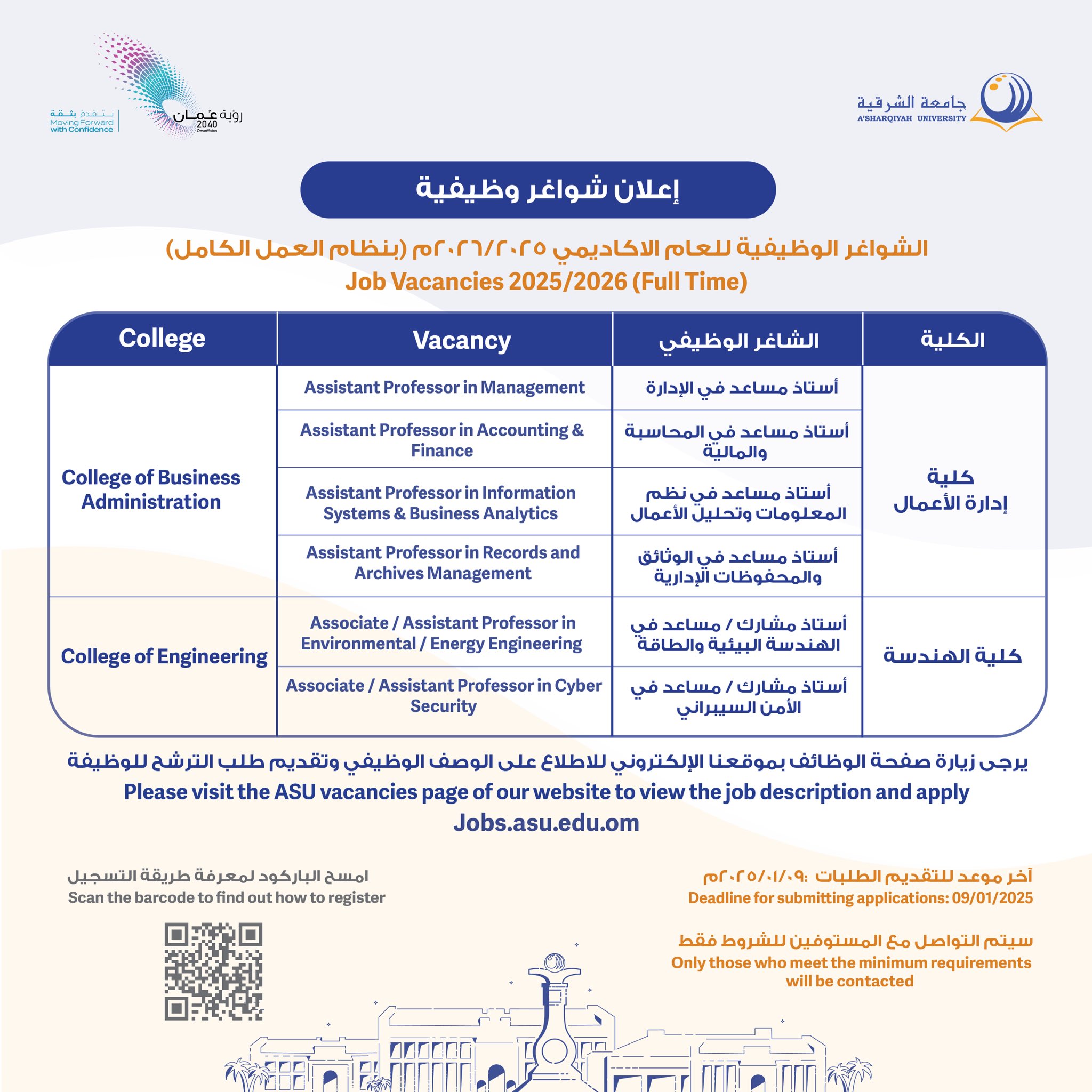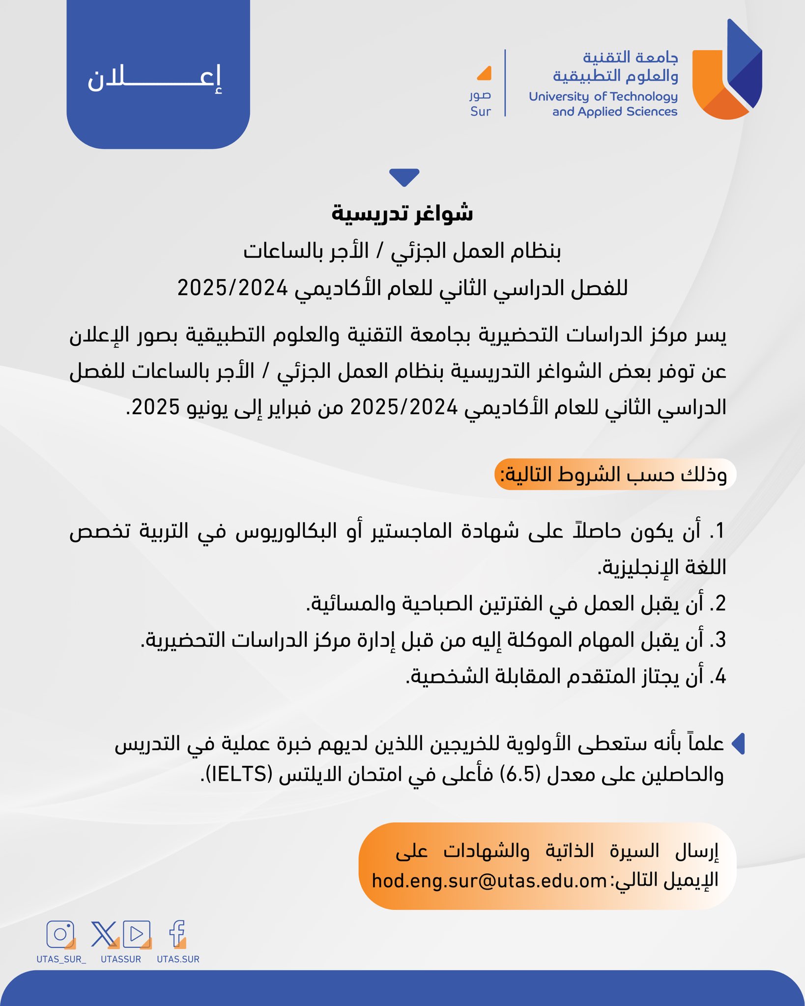 جامعة التقنية والعلوم التطبيقية بصور - توفر بعض الشواغر التدريسية بنظام العمل الجزئي / الأجر بالساعات