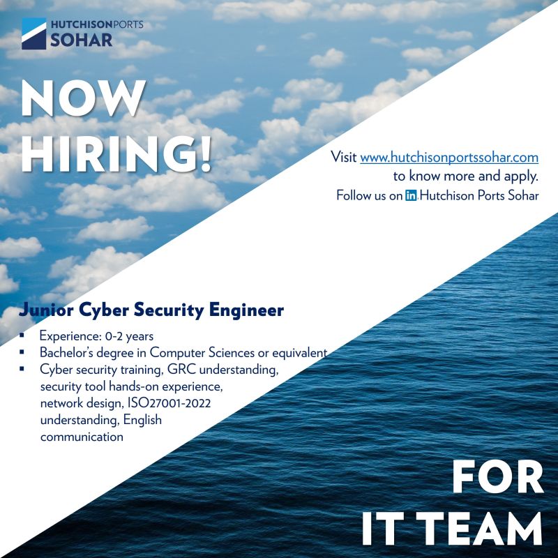 شركة موانئ هاتشيسون صحار - وظيفة شاغرة ( Junior Cyber Security Engineer )
