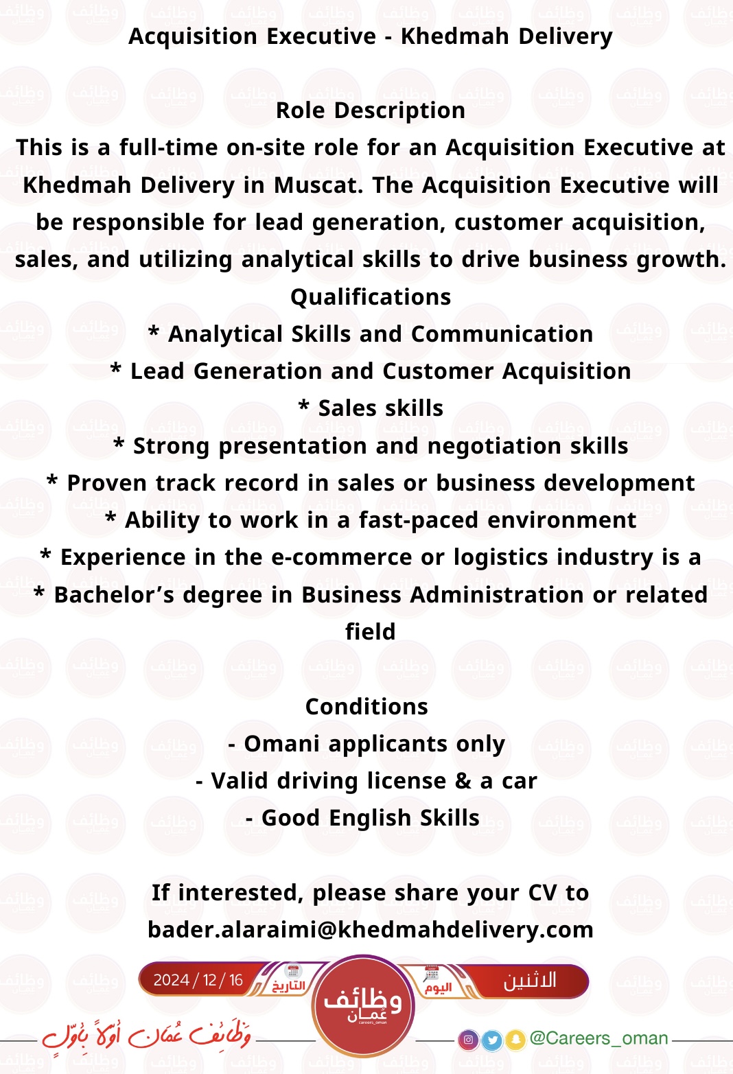 شركة توصيل في مسقط - وظيفة شاغرة ( Acquisition Executive - Khedmah Delivery )