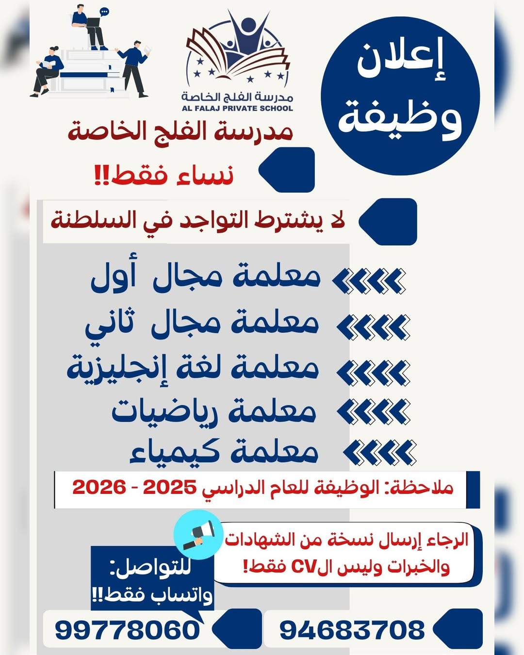 مدرسة الفلج الخاصة - فرص وظيفية ( معلمات )