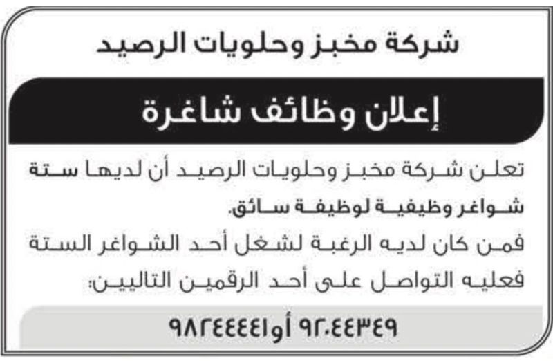 شركة ومخبز وحلويات الرصيد - فرصة وظيفية ( سائق العدد 6 )