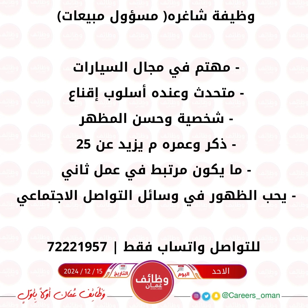معرض سيارات في المعبيلة - وظيفة شاغرة ( مسؤول مبيعات )
