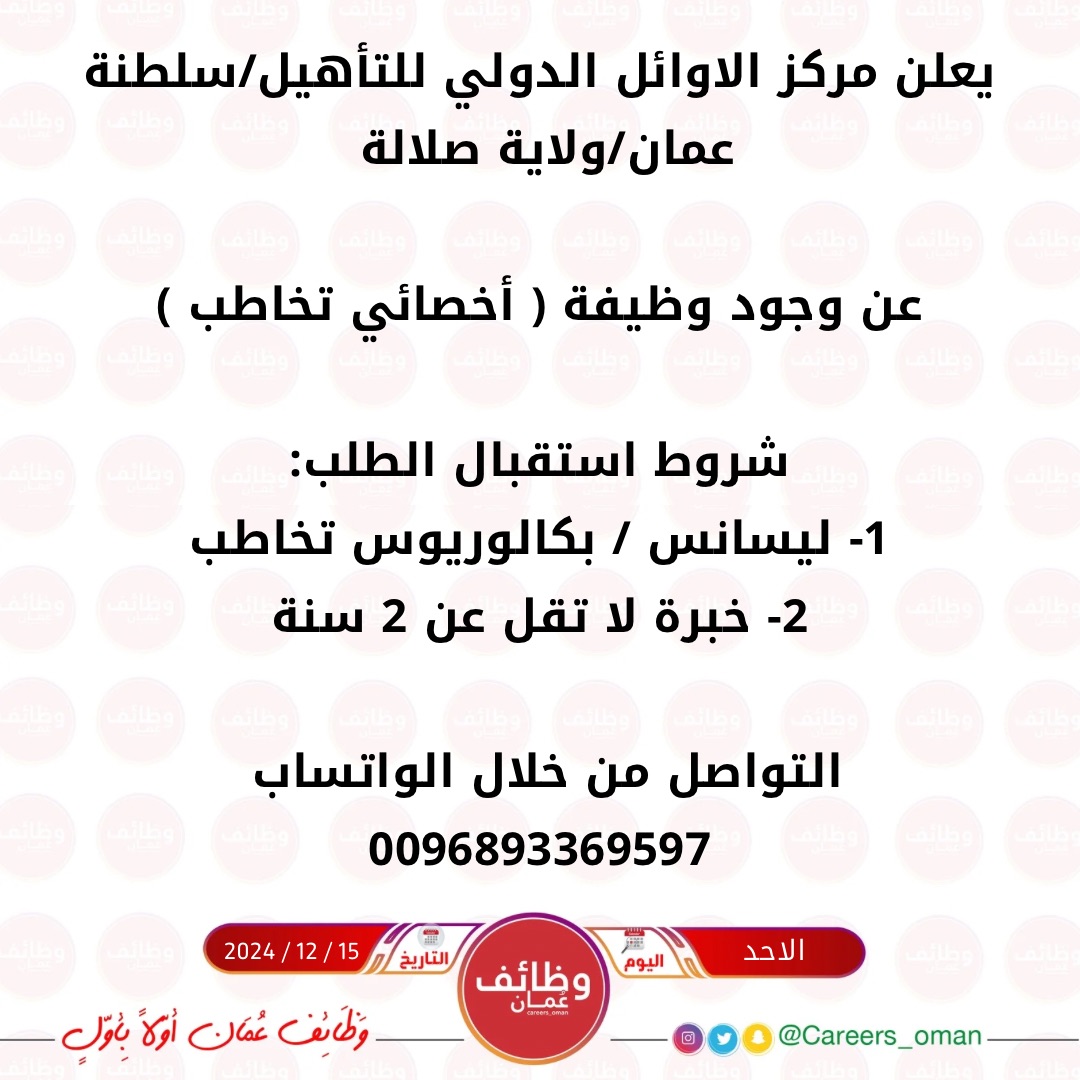 مركز الاوائل الدولي للتأهيل في ولاية صلالة - وظيفة شاغرة ( أخصائي تخاطب )