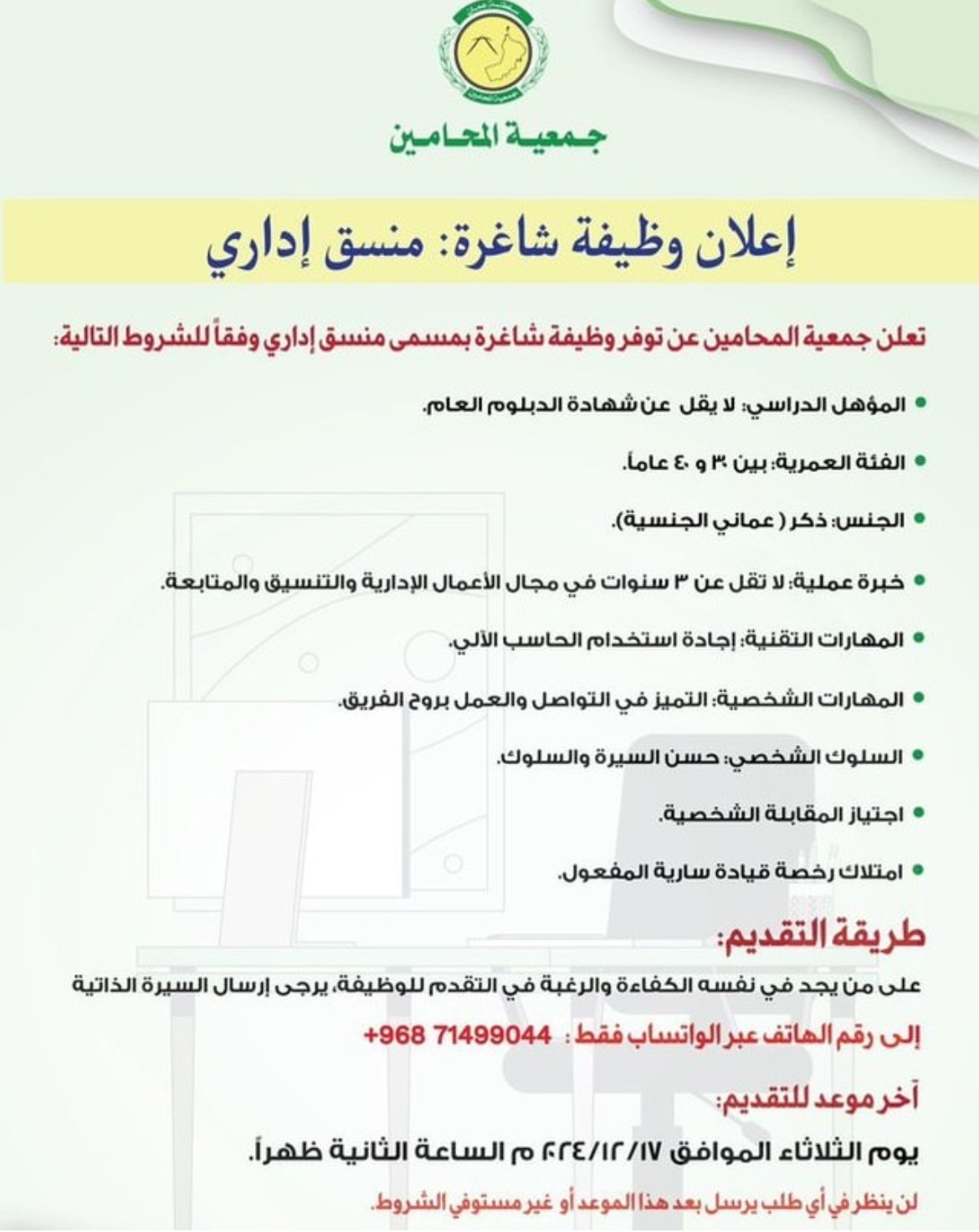 جمعية المحامين - وظيفة شاغرة ( منسق إداري )