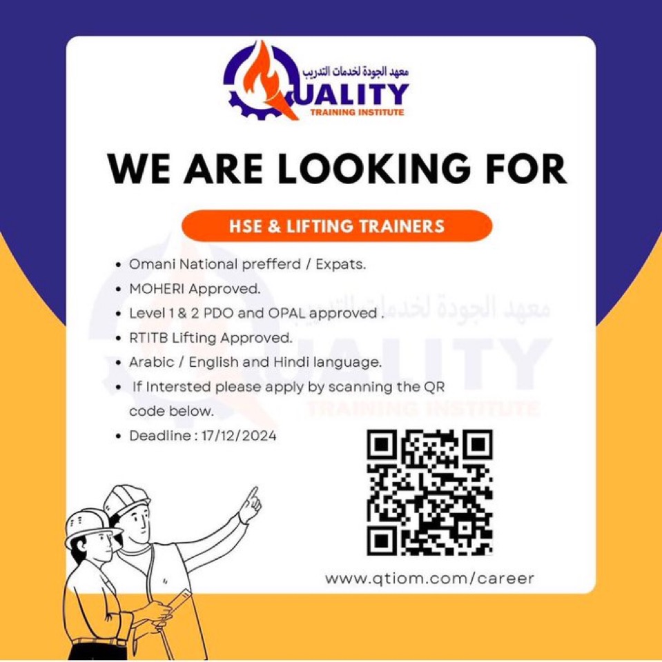 معهد الجودة لخدمات التدريب - فرصة وظيفية ( HSE & LIFTING TRAINERS )