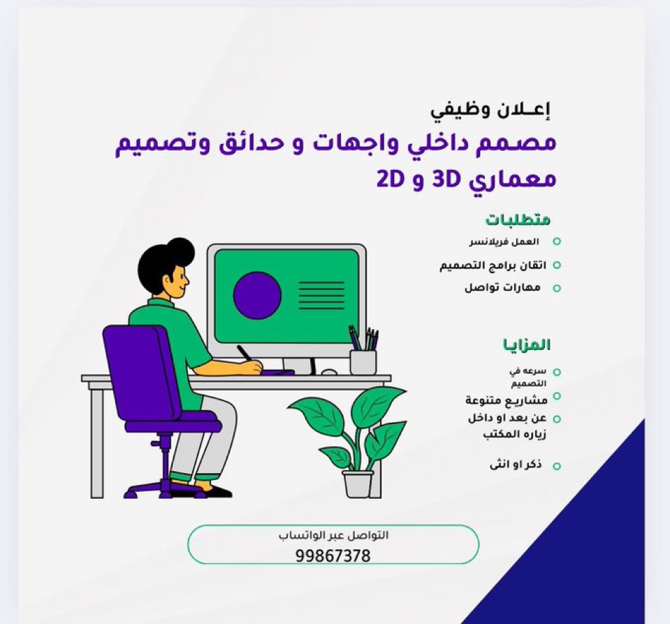 شركة رائدة في نزوى - وظيفة شاغرة ( مصمم داخلي واجهات وحدائق وتصميم معماري 3D و 2D )