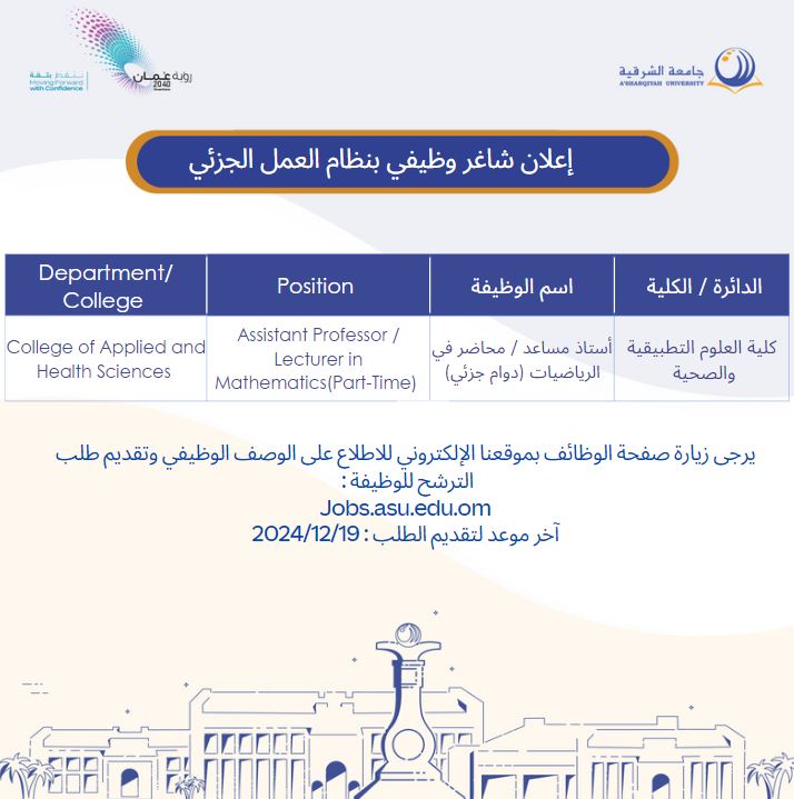 جامعة الشرقية - وظيفة شاغرة ( أستاذ مساعد / محاضر في الرياضيات / دوام جزئي )