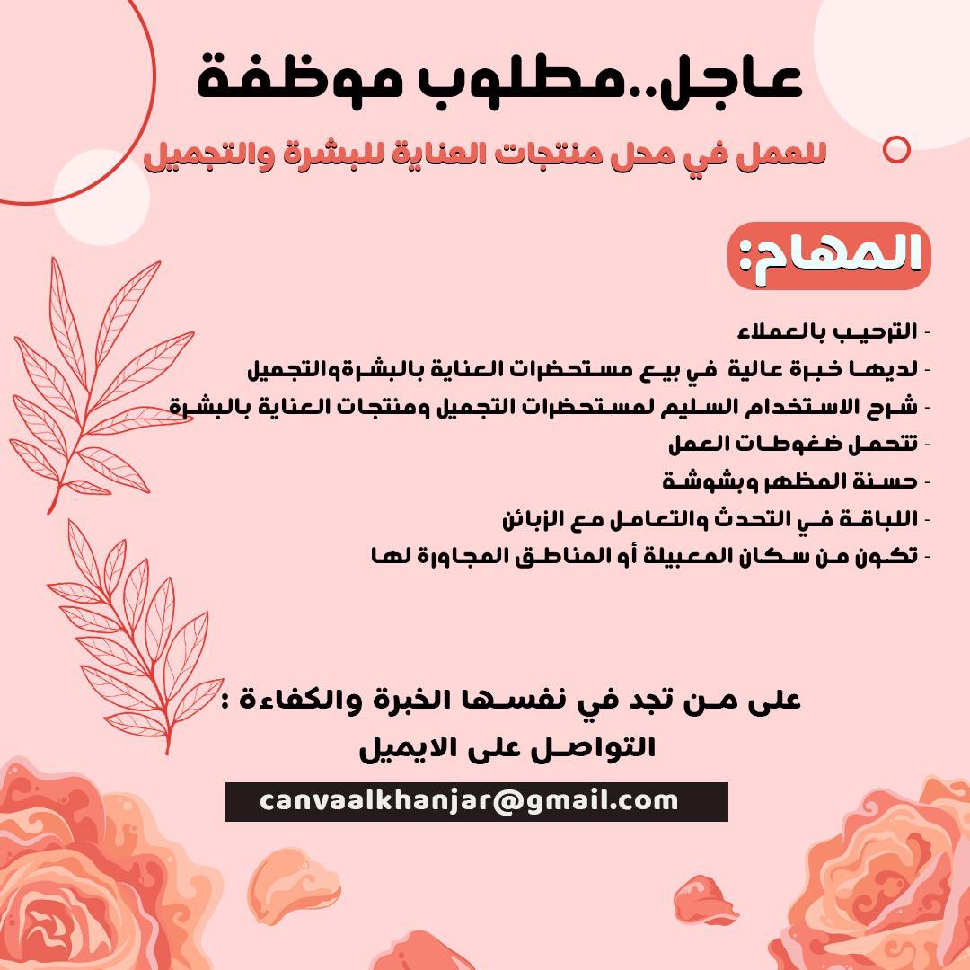 محل منتجات العناية للبشرة والتجميل في مسقط - وظيفة شاغرة ( موظفة )