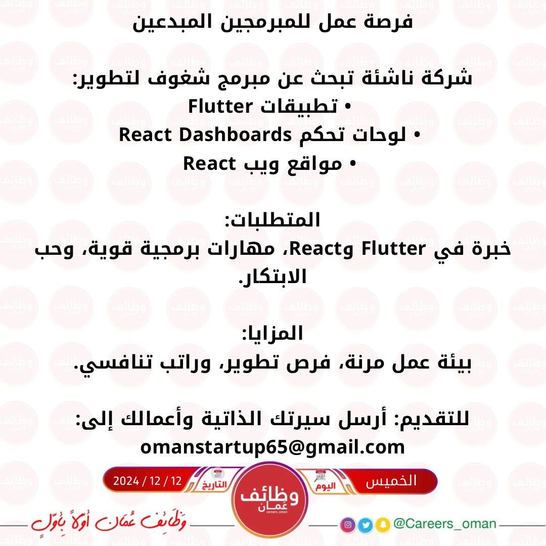 شركة ناشئة تبحث عن مبرمج شغوف لتطوير تطبيقات ولوحات التحكم ومواقع ويب