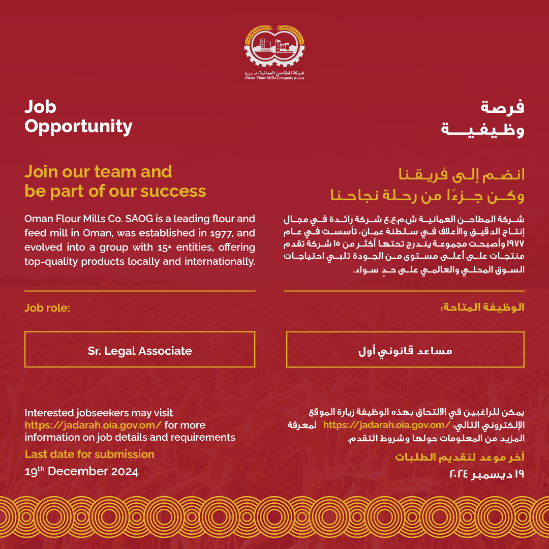 شركة المطاحن العمانية - وظيفة شاغرة ( مساعد قانوني أول )