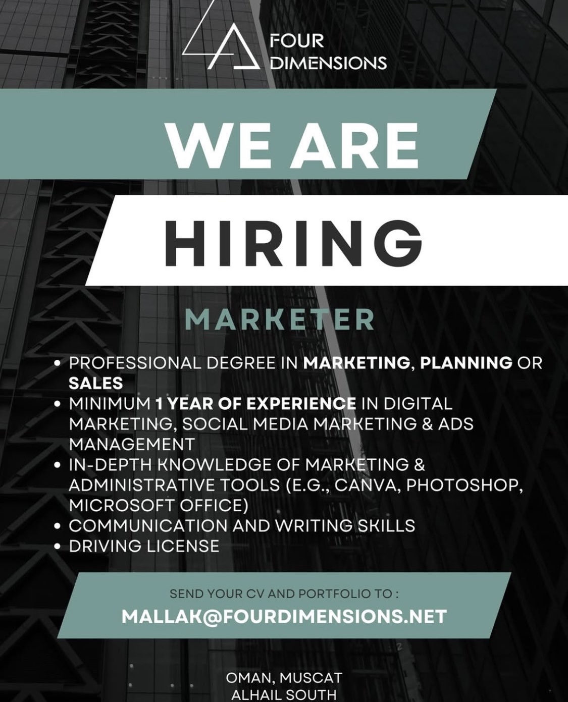 شركة FOUR DIMENSIONS في الحيل - وظيفة شاغرة ( MARKETER )