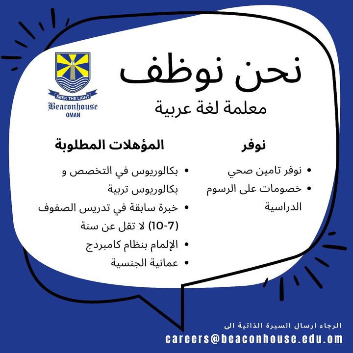 مدرسة بيكون هاوس الخاصة - فرص وظيفية ( معلمة اللغة العربية + اللغة الإنجليزية )