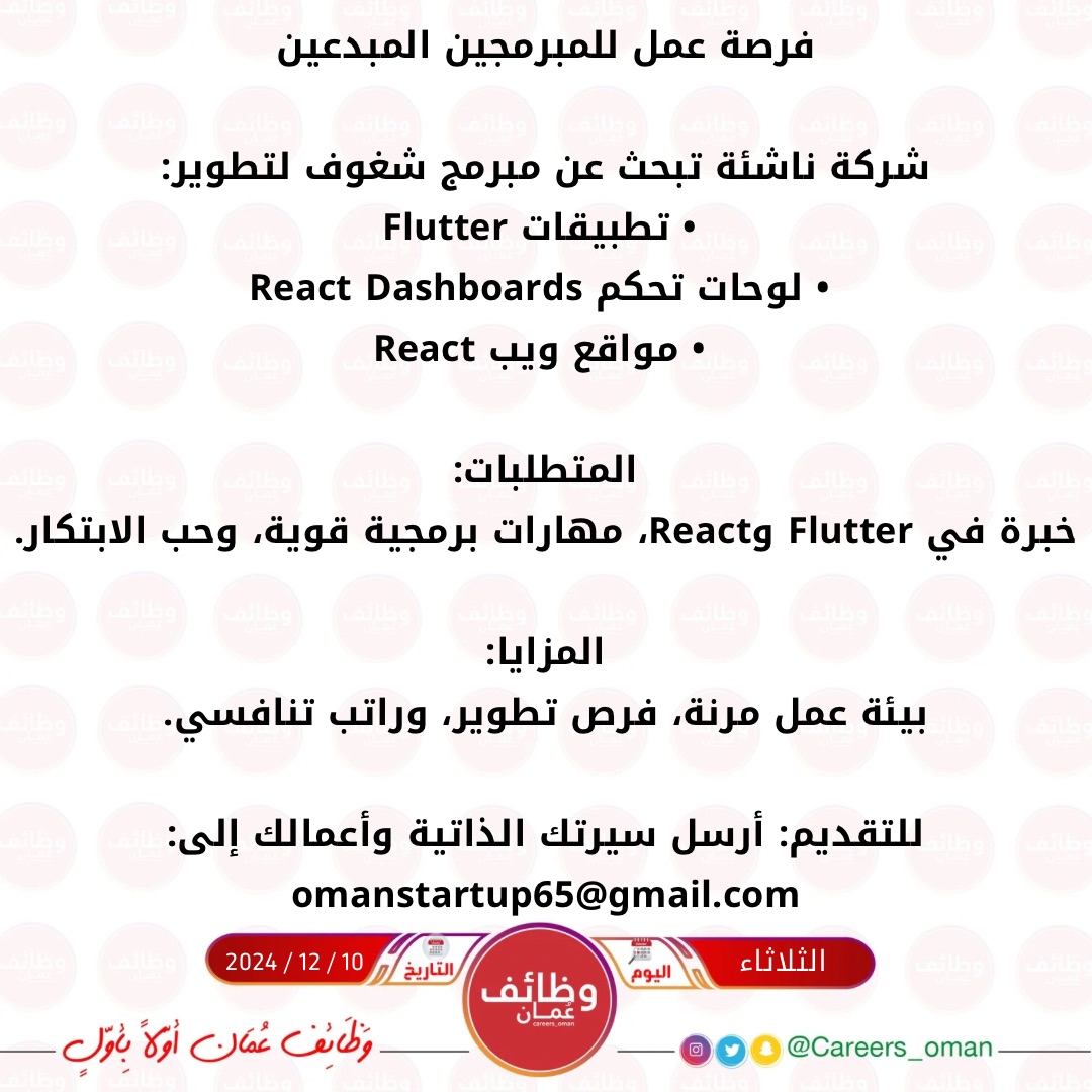 شركة ناشئة تبحث عن مبرمج شغوف لتطوير تطبيقات ولوحات التحكم ومواقع ويب