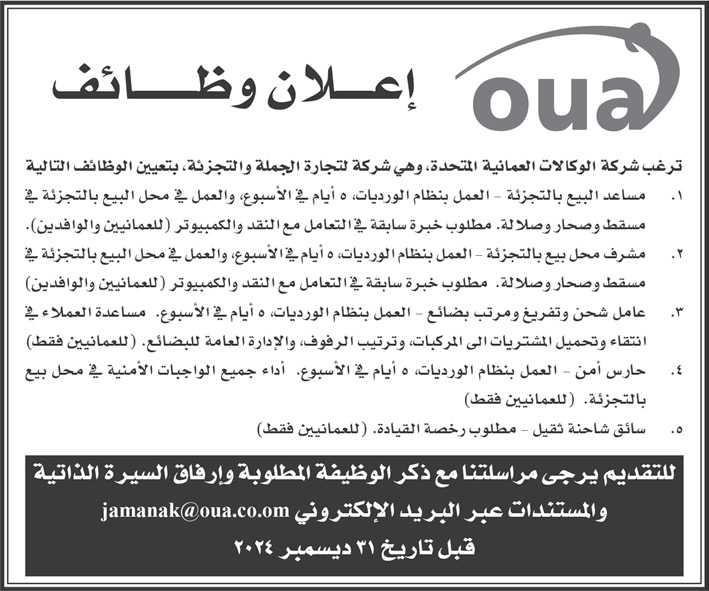 شركة الوكالات العمانية المتحدة - 5 وظائف شاغرة