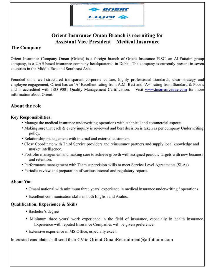 شركة أورينت للتأمين - وظيفة شاغرة ( Assistant Vice President - Medical Insurance )