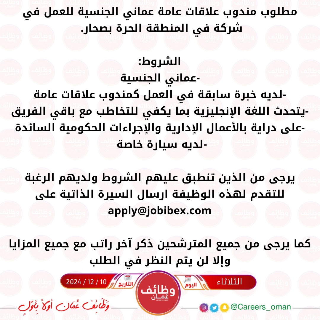 شركة في المنطقة الحرة بصحار - وظيفة شاغرة ( مندوب علاقات عامة )