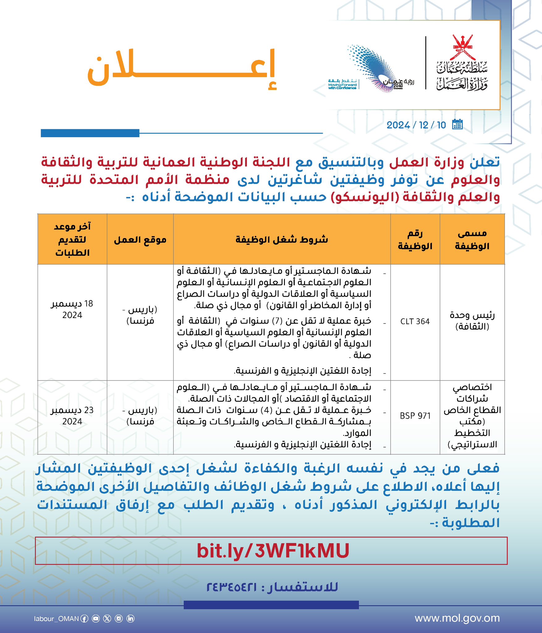 وزارة العمل وبالتنسيق مع اللجنة الوطنية العمانية للتربية والثقافة والعلوم - توفر وظيفتين شاغرتين لدى منظمة (اليونسكو)