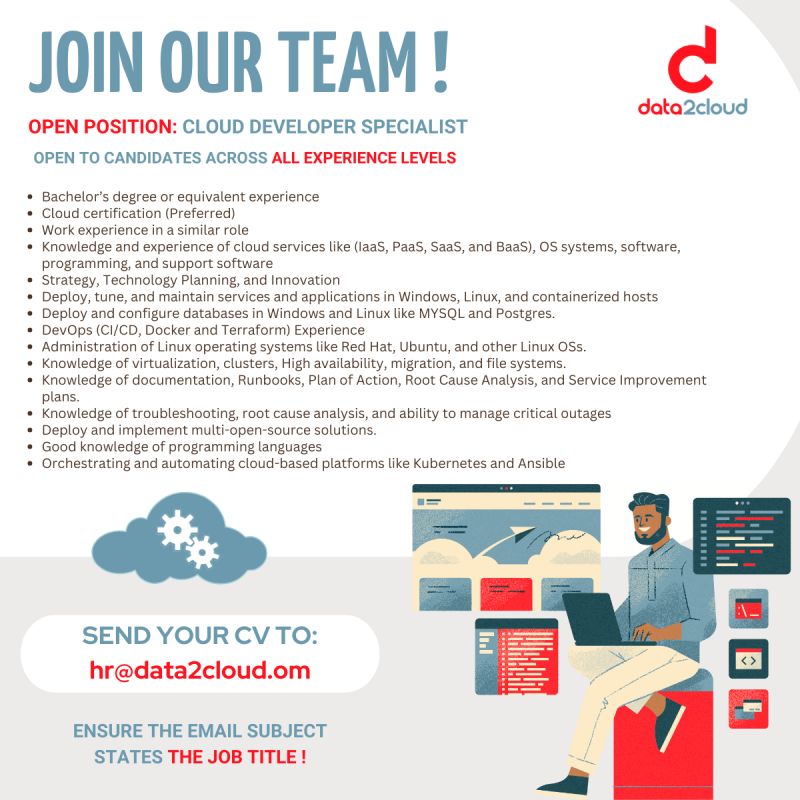 شركة data2cloud - وظيفة شاغرة ( CLOUD DEVELOPER SPECIALIST )