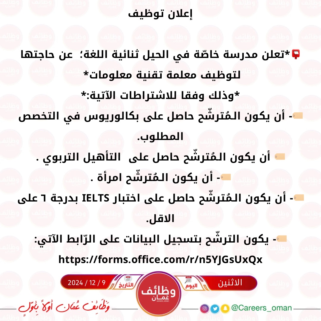 مدرسة خاصة في الحيل ثنائية اللغة - وظيفة شاغرة ( معلمة تقنية معلومات )