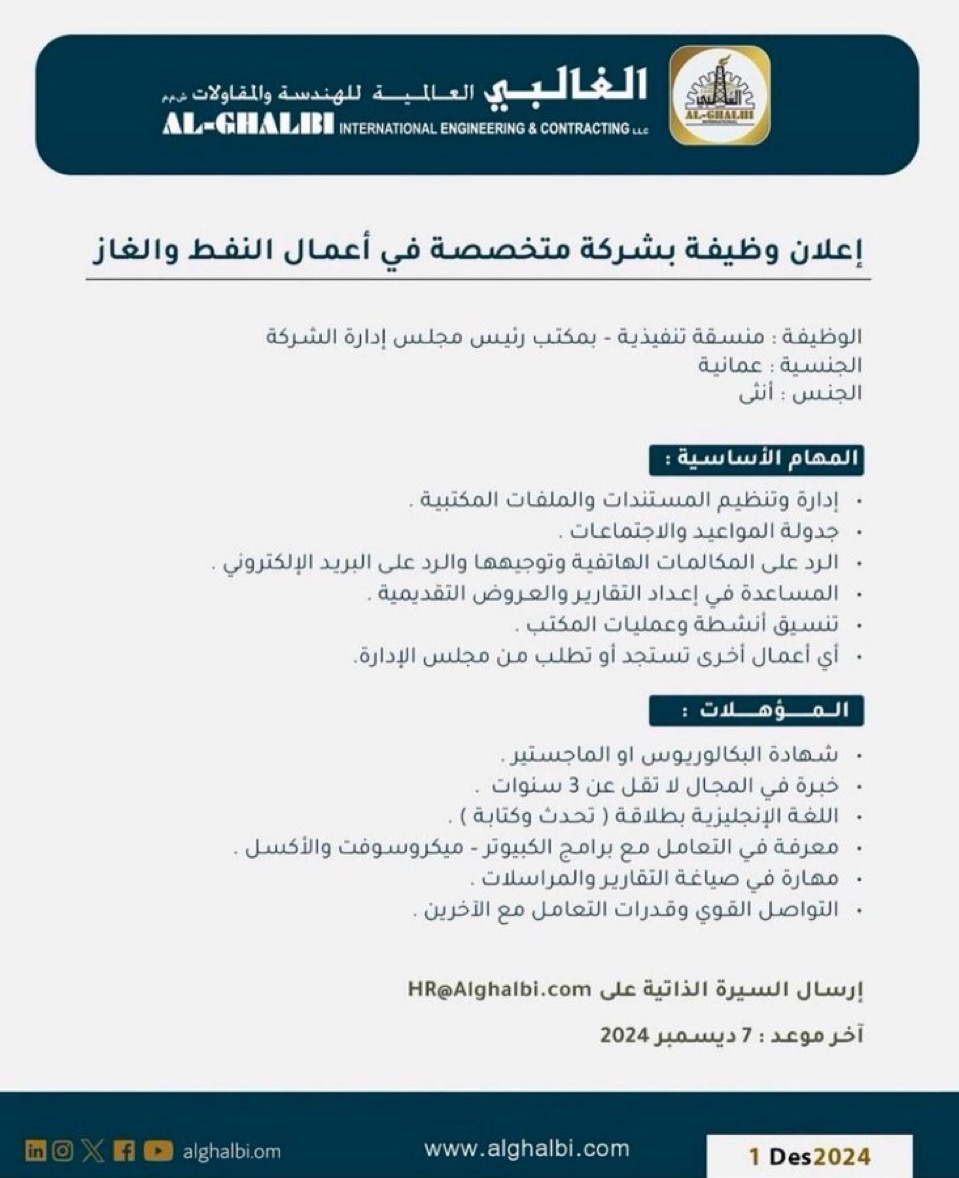 الغالبي العالمية للهندسة والمقاولات - وظيفة شاغرة ( منسقة تنفيذية )