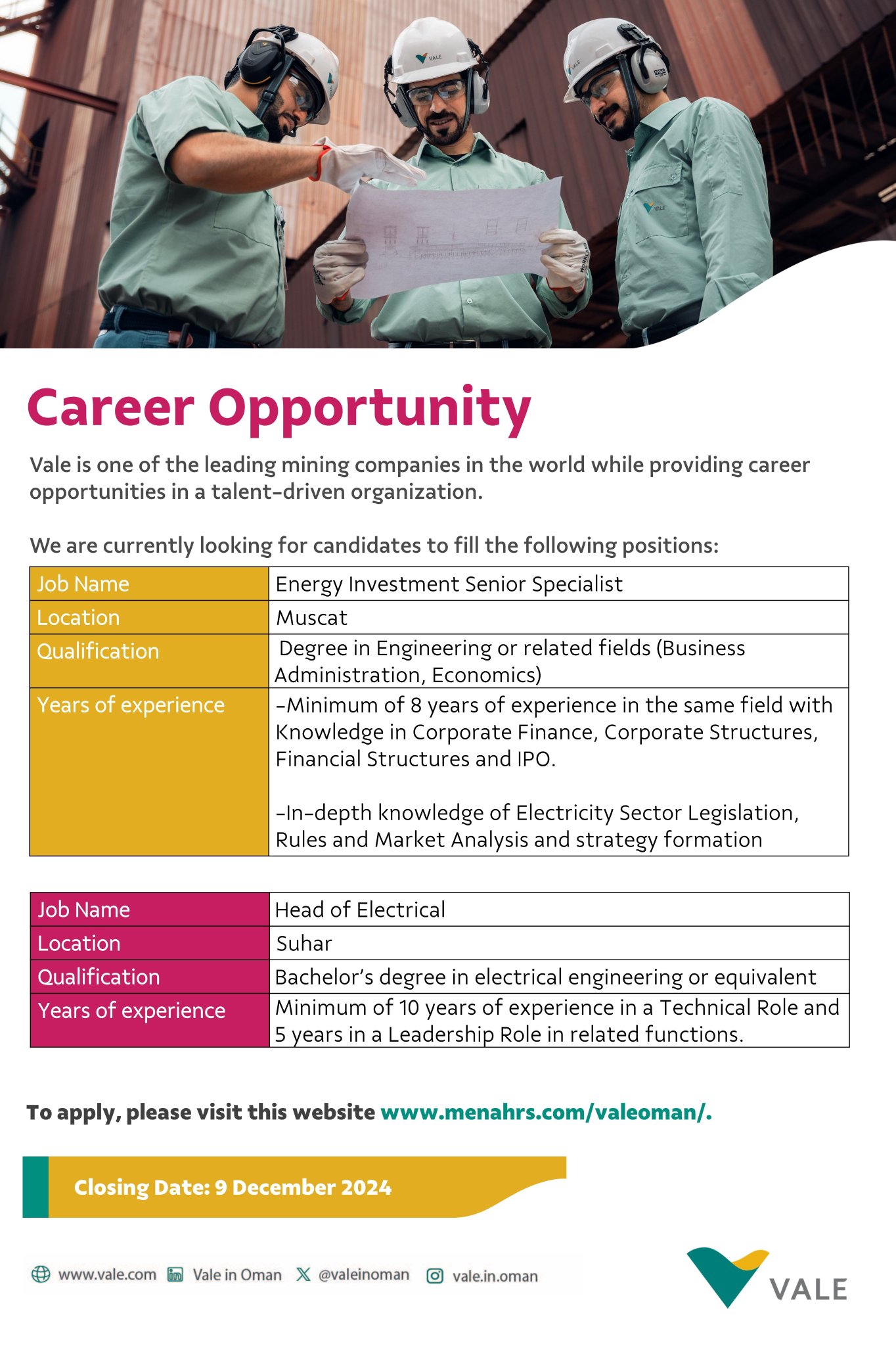 شركة فالي Vale - وظيفة شاغرة ( Energy Investment Senior Specialist )