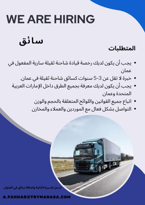 شركة رائدة في خدمات اللوجستية والتجارية لتطوير لسلاسل الامداد - وظيفة شاغرة ( سائق شاحنة ثقيلة )