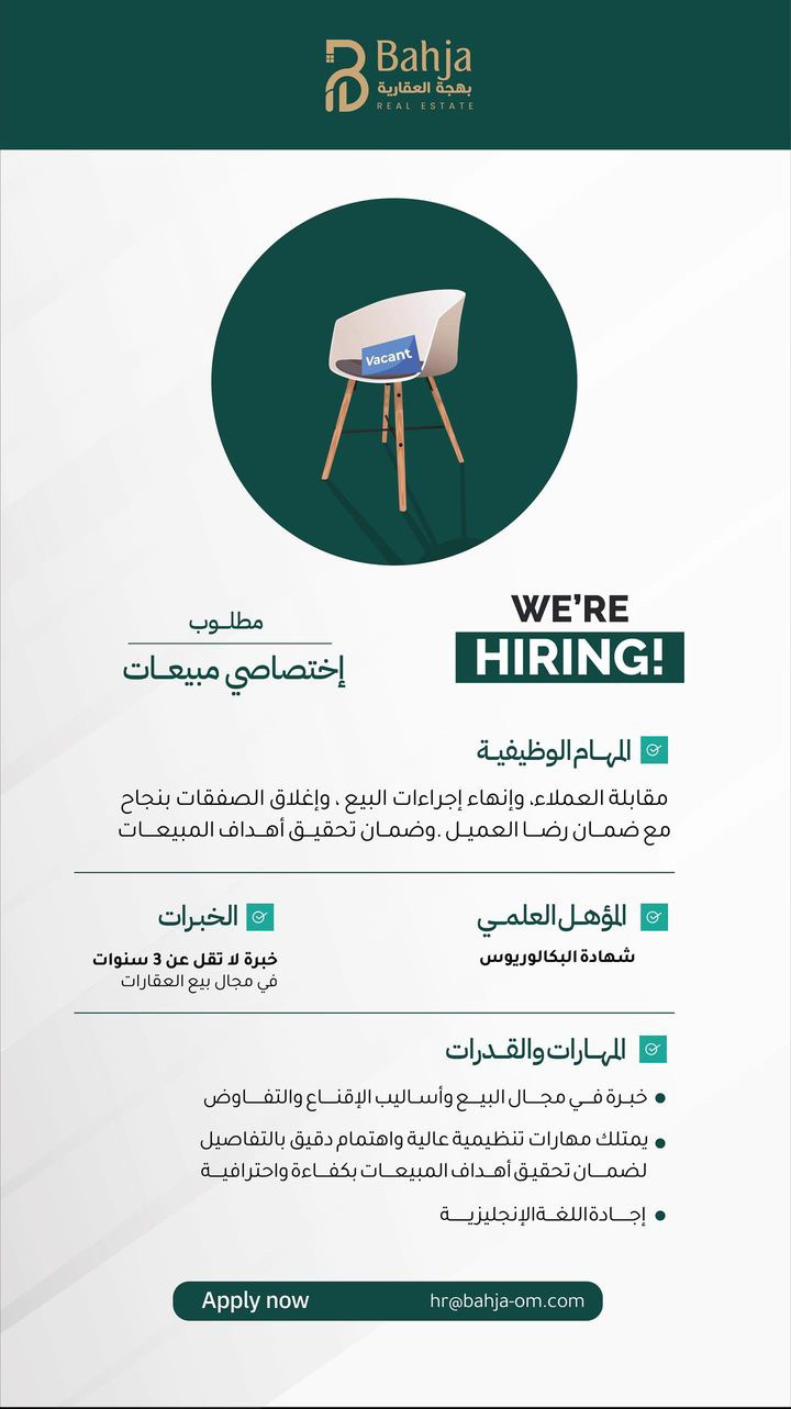 بهجة العقارية - وظائف شاغرة ( إختصاصي مبيعات + إختصاصي إدارة مباني )