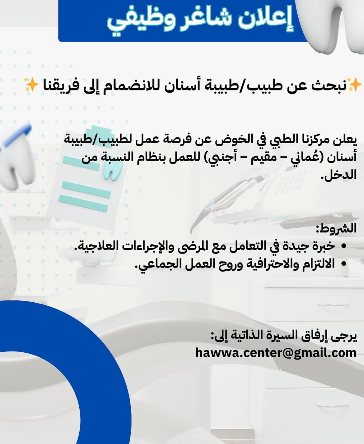 مركز حواء الطبي - وظيفة شاغرة ( طبيب/ة أسنان )