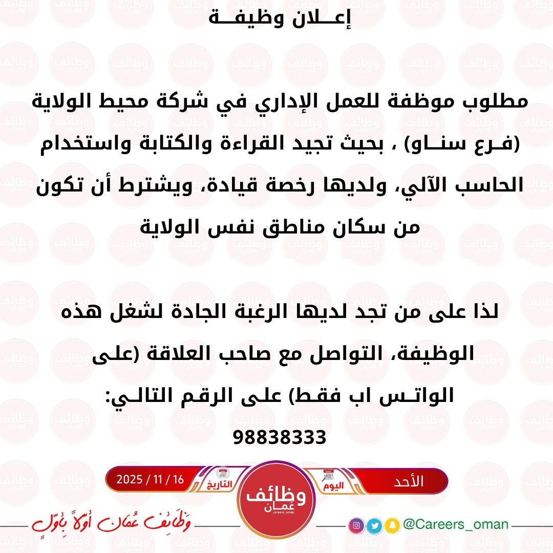 شركة محيط الولاية فرع سناو - وظيفة شاغرة ( موظفة )