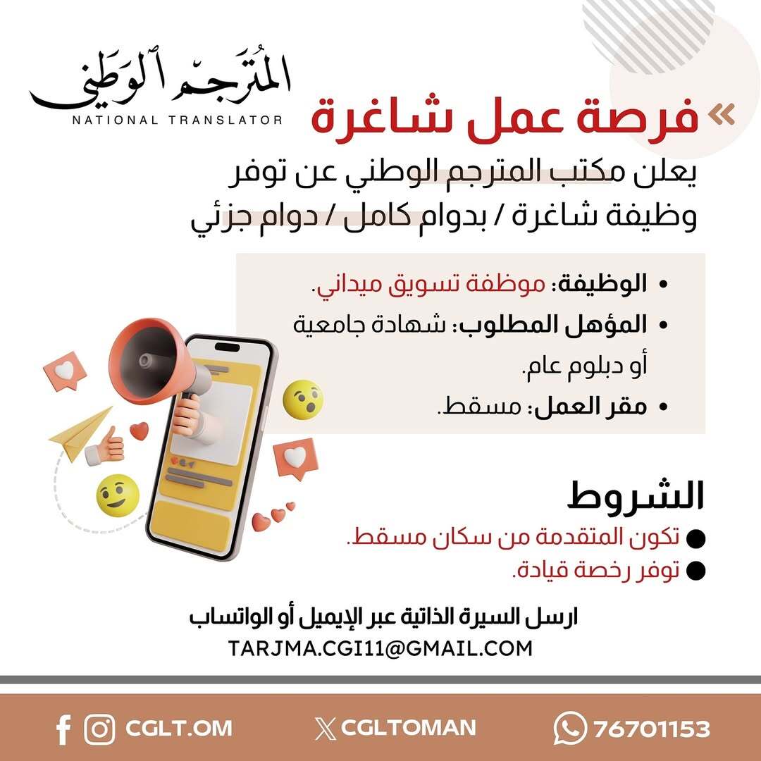 مكتب المترجم الوطني في مسقط - وظيفة شاغرة ( موظفة تسويق ميداني )