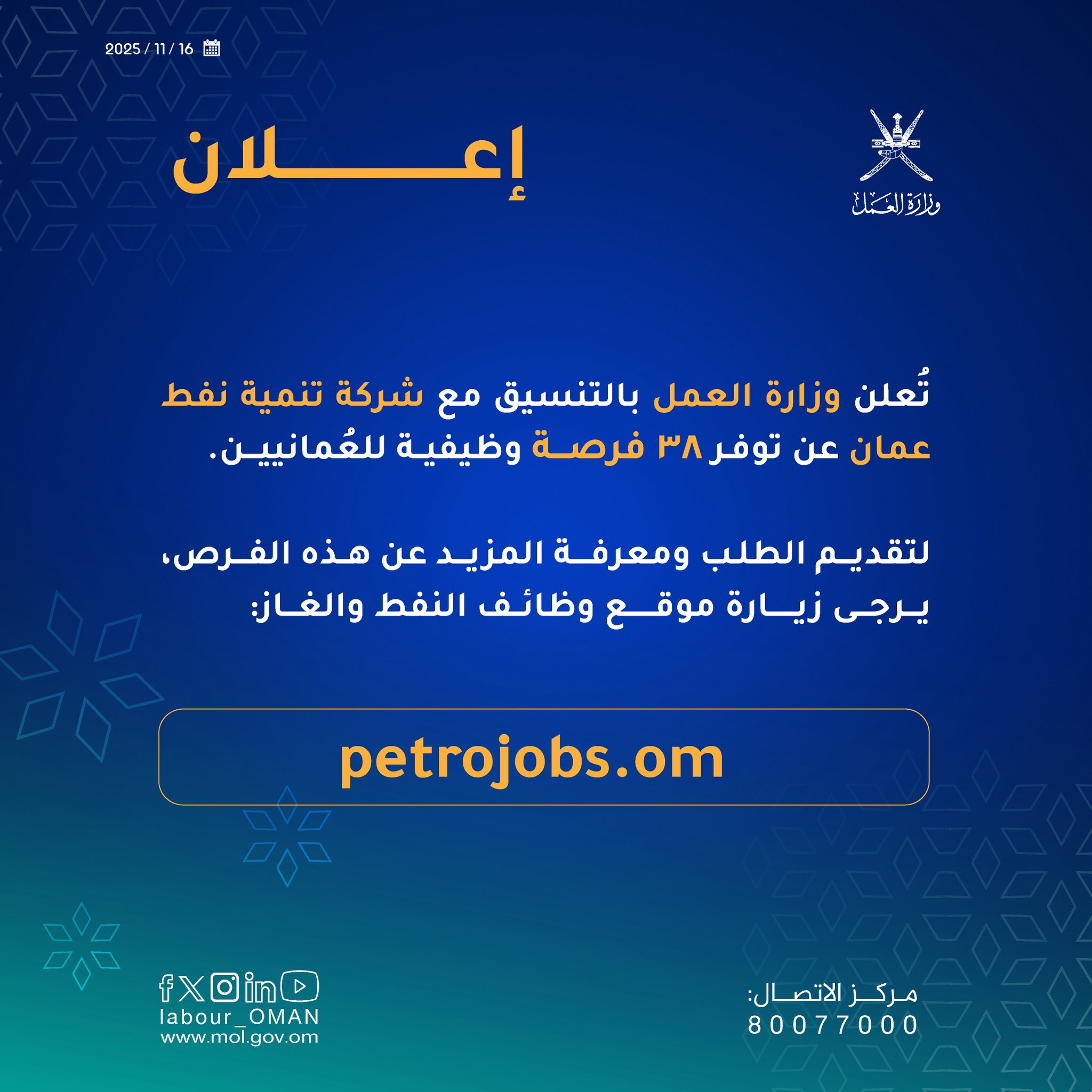 وزارة العمل بالتنسيق مع شركة تنمية نفط عمان - توفر 38 فرصة وظيفية للعُمانيين