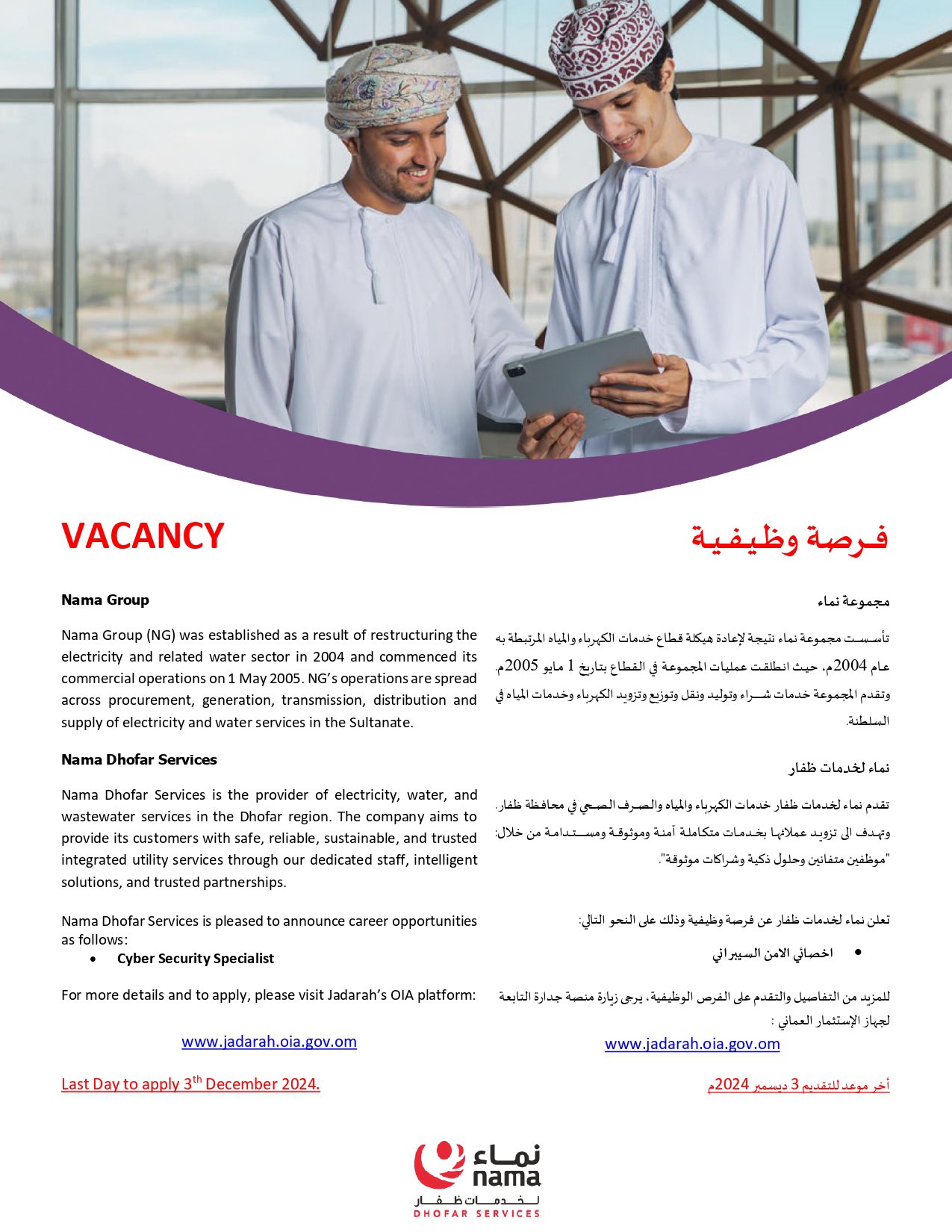 نماء لخدمات ظفار - وظيفة شاغرة ( أخصائي الأمن السيبراني )