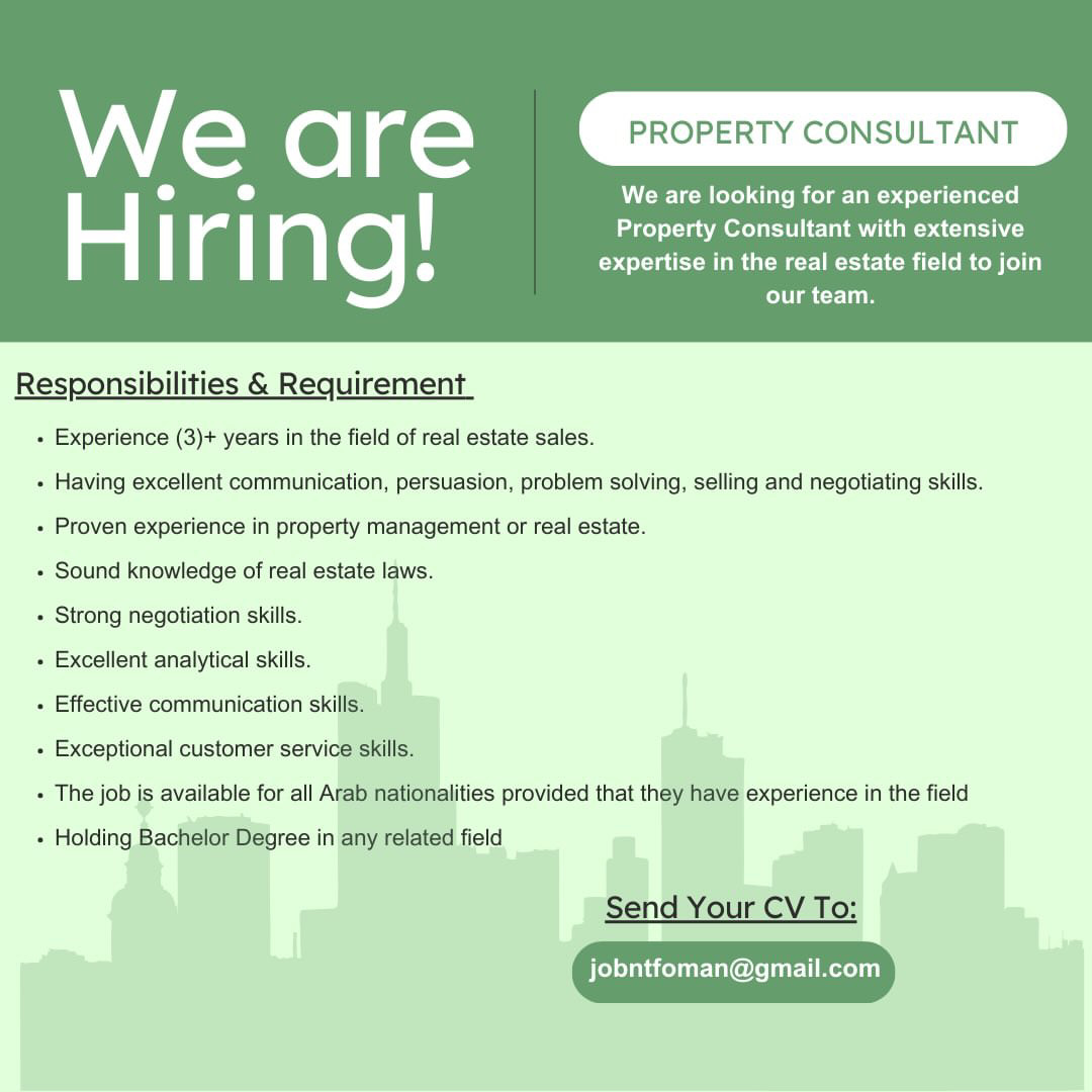شركة رائدة في المجال العقاري - وظيفة شاغرة ( PROPERTY CONSULTANT )